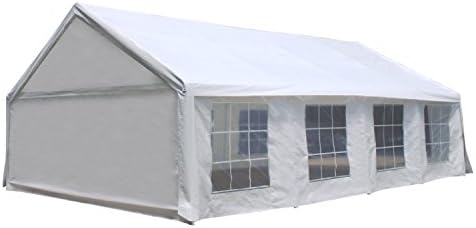 This White Heavy Duty outdoor event tent is made to be able to withstand rain and sunshine to protect you and your guests. This larger canopy is often used for events like weddings, fairs, festivals, storage and much more. It has multiple uses including; outdoor car/ boat storage, weddings, reunions, and events. Requires about 7-9 people to set up due to its size. The roof is not built to withstand large amounts of water or snow but is perfect for normal weather fluctuations. The included anchoring system is required to hold down this large structure safely. Sidewalls are made with windows for good lighting and an elegant design. Ships in four different boxes due to its size. Please get assistance when setting the tent up. Secure properly with steel tubes and the anchoring system to keep it secure. FEATURES: 20 x 30 Ft Heavy Duty party or storage tent Very large in size for outdoor events – 10 feet maximum height with 6.5 sidewall height, 20 Width x 30 Length in feet High quality powder coated steel framework, very stable and durable tent structure All joints made of steel for strong support: Steel tube DIA 1.5 Inches (38 mm) Heavy duty waterproof and weatherproof fabric canopy with sidewalls: 180 gsm, PE (polyethylene woven), PVC coated for UV protection High strength metal joint fittings for the utmost stability, provides up to 600 square feet of shade 10 corkscrew pegs included