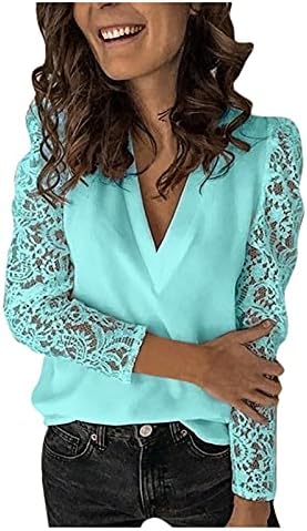 ZEFOTIM Deep V Neck Shirts Women,Spring Casual Lace Trim Plain Tops Shirts Trendy Long Sleeve Slim Tunic Blouse Tees